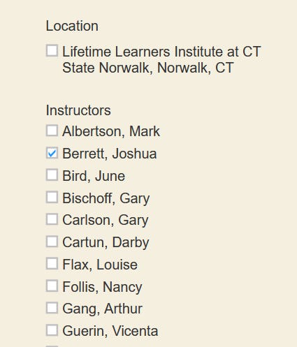 When you arrive at the Lifetime Learners page, look for Joshua Berrett’s name in the column on the left. Check the box beside his name and you’ll be taken to the course description and registration form (see below). The course will be a lot of fun.